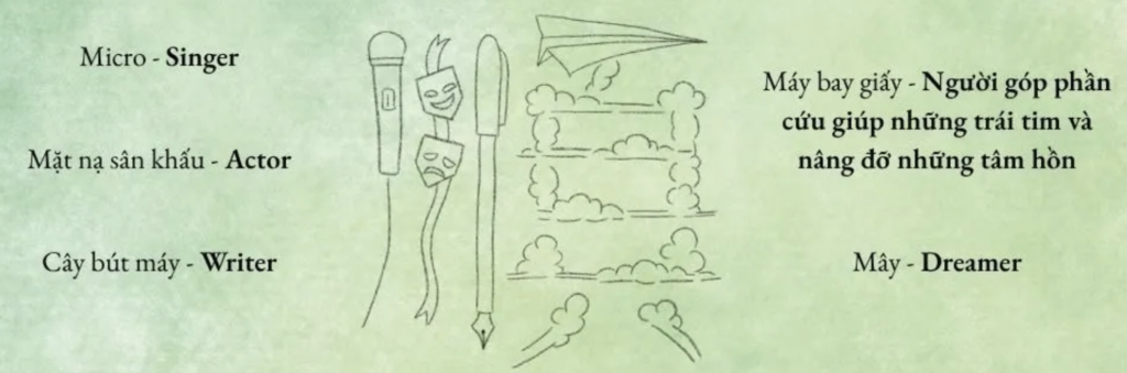 Mình cũng phải cân nhắc rất nhiều những yếu tố gì sẽ là đặc trưng nhất với một người đa sắc như anh Jun. Một tiếng đồng hồ mình lên ý tưởng để ra được biểu tượng này, dựa trên các vai trò của anh Jun. 4/5 vai trò được đưa vào thiết kế của mình có nằm trên bio của anh, là những nghề mà anh làm. Vai trò thứ 5 là một vai trò “không chính thức”, tuy nhiên cũng mang rất nhiều ý nghĩa.