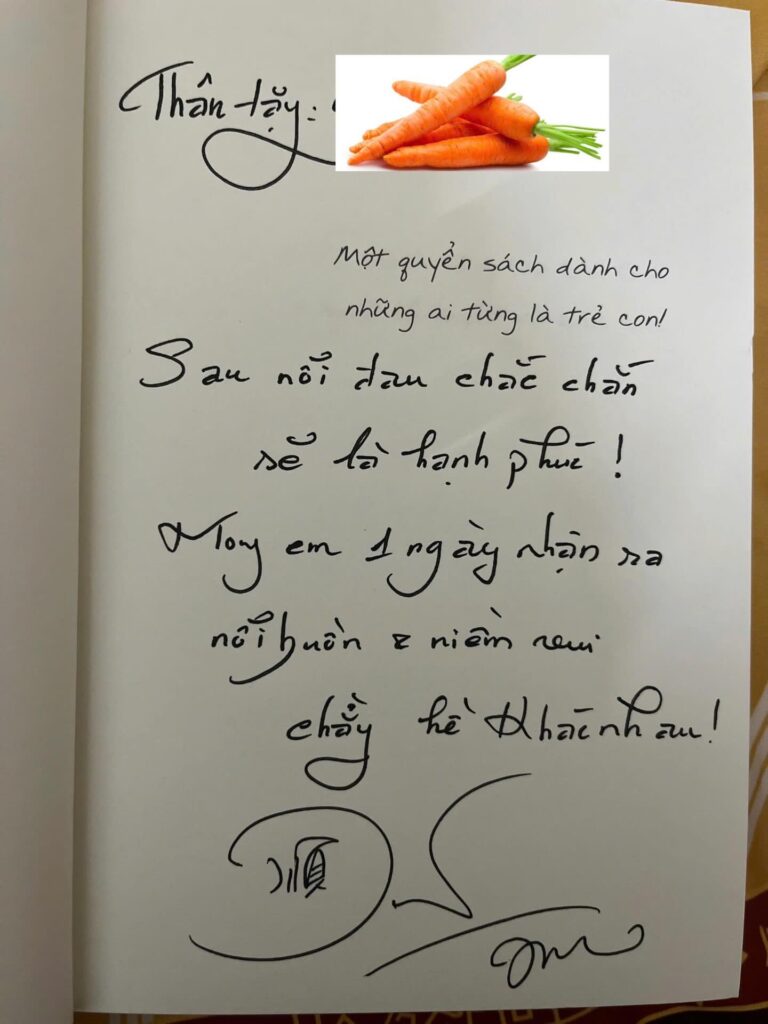 Đó là thời gian tương đối khó khăn với mình, khi gặp khá nhiều vấn đề trong cuộc sống. Rồi mình “bắt” được câu nói của người tác giả mình yêu mến: “Hôm nay là một câu chuyện buồn, nhưng ngày mai nó sẽ là một câu chuyện vui.” Điều kì diệu hơn (đối với mình), đến phần fansign, anh tặng mình câu viết: “Sau nỗi đau sẽ là hạnh phúc. Anh mong một ngày em sẽ nhận ra, niềm vui và nỗi buồn chẳng hề khác nhau.” Để mình có thêm niềm tin rằng, cứ sống tích cực thôi, vì cái gì cũng sẽ qua, vì “sau nỗi đau sẽ là hạnh phúc”.